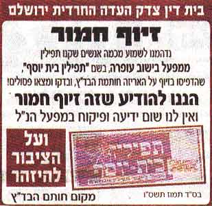 י"ד תמוז תשס"ו![]() פרסום ב"המודיע", המתריע בפני זיוף של חותמת הבד"ץ. גם אנו בתפילין בית א-ל, נתקלים מדי פעם במקרים שבהם הונו אנשים ואמרו להם שהם רוכשים תפילין תוצרת תפילין בית א-ל או בהשגחת תפילין בית א-ל, למרות שהדבר היה שקר, והתפילין לא היו מתוצרת המפעל. על כן, חשוב מאוד לדעת גם ממי קונים ולא להסתמך על שרלטנים כאלה או אחרים שמוכרים תפילין ללא השגחה, או שמתחזים למפעלים ידועים ומוכרים. אנו נשמח אם הציבור יעדכן אותנו במקרים נוספים של מתחזים למוכרי תפילין בית א-ל. |