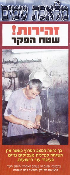 י"ד תמוז תשס"ומתוך עלון "מלאכת שמים" של מפקחי הסת"ם.כפי שניתן לראות בתמונה, ישנם הרבה פרצות בשוק מוצרי הסת"ם, בתמונה רואים שעיבוד הרצועות נעשה ע"י גוי, כאשר העיבוד נעשה ע"י גוי, וללא השגחה, סביר להניח שהתהליך לא נעשה לשם קדושת תפילין שלבי העשייה החשובים צריכים להיעשות לשמה. השלב הסופי של עיבוד הרצועות, שנחשב ל"עבודה חשובה", כשנעשה שלא לשמה, פוסל את הרצועות. לכן חשוב ביותר לרכוש את הרצועות ממקור נאמן וכשר לכתחילה. אנו בתפילין בית א-ל, מקפידים שכל הרצועות, הגידים, וכל החומרים הדרושים לעשיית התפילין יהיו עשויים לשם קדושת התפילין. |