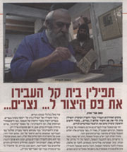 בימים האחרונים העבירו בעלי החברה המוכרת "תפלין בית קל" את פס היצור שלהם ל...נצרים... כזכור הישוב הראשון ששרון סימן את תושביו כמיועדים לגרוש. יחד עם המפעל עברו לנצרים גם ארבע משפחות של עובדים, ובניהם הסמכ"ל, מאיר רז. בצד עובדים אלה ילקוט הפעל עובדים מתושבי נצרים הותיקים יותר. מזכיר ועדת רבני יש"ע ומנהל המפעל, הרב ישי באבד, מסר כי הרשויות ניסו להתנכל למפעל, למשל על ידי סירוב של חברת 'בזק' שמערבת פוליטיקה בעסקים, לחבר קו טלפון, במטרה לחבל בתפקוד המפעל, והכל מחשש שמפעל התפילין אינו אלא סנונית שמבשרת את בואם מפעלים רבים נוספים. עוד מקל בגלגלי מכונת הגרוש. גימור התפילין של 'תפילין בית קל' ייעשה מעתה בנצרים. בנצרים ייוצרו מוצרי היוקרה של המפעל, כמו ה"קופסהוד" המיוחדת שלו, וכן ה"תפידנית", על משקל "צידנית", אריזה סביב ה"תפידנית" כבר מתרחש סיפור מעניין: קולנל בצי האמריקאי שמשמש כרופא הראשי של הצי, שהוא יהודי דתי, שמע על התפידנית וקנה עותק אחד שלה, וזאת משום שכקצין בצי הוא נזקק לתפילין עמידהם במים, ועתה הוא שוקל להזמין כשלוש מאות "התפידנית" לטובת החיילים היהודיים-דתיים שלוקחים בצי האמריקאי, רובם אגב בעירק. כך שיתברר כי נצרים עובדת עבור הצי האמריקאי בעירק. |